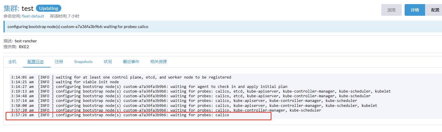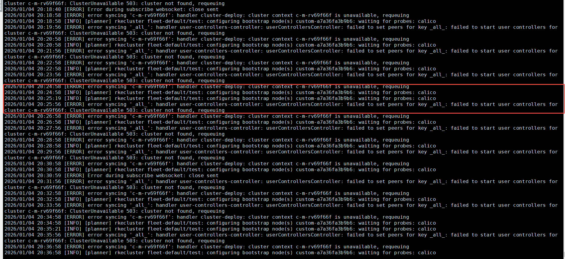 我就一直等着rk2集群启动,刚开始rancher-agent服务是running状态,rk2-server服务是没启动,我等待rk2自己拉取,rk2-server服务也启动成功了,但还是卡在拉取calio网络,我看rancher容器日志k3s会被杀掉进程重启,然后我重启容器,rancher-agent服务就启动报错了。k3s不断重启。。。现在是rancher直接崩了。
