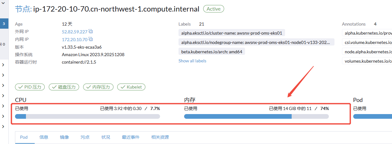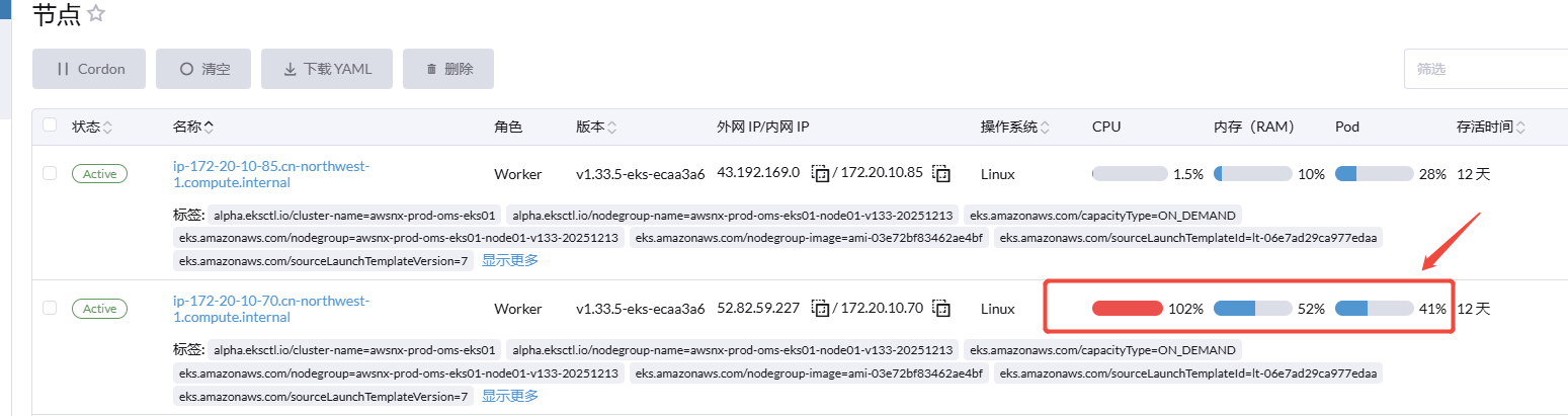 登录rancher UI - 节点 首页,显示的节点CPU、内存使用率与节点详情页中的使用率不同步,节点首页显示的数据不正确,详情页是正确的。rancher对eks资源监控通过kube-system/metrics-server 服务提供指标。