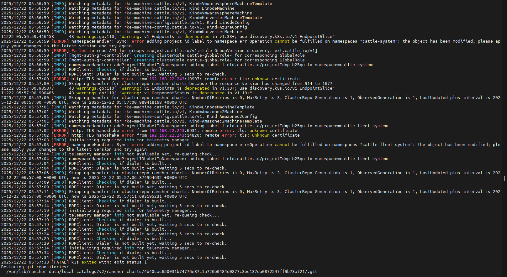 2025/12/22 07:54:21 [ERROR] Failed to install system chart fleet (release name: fleet): pod cattle-system/helm-operation-tqz5h failed, watch closed
