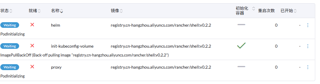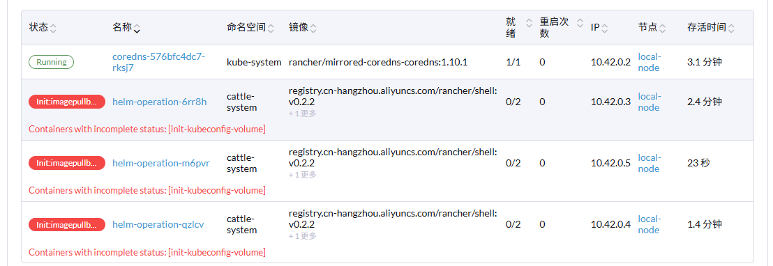 问题2: `Helm pod 都是失败,提示 Containers with incomplete status: [init-kubeconfig-volume], 换了好几个不同版本都没成功过