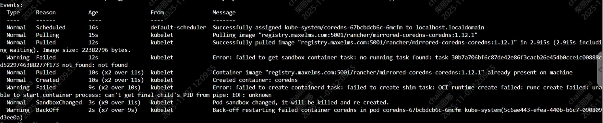 Normal Pulling 15s kubelet Pulling image "registry.maxelms.com:5001/rancher/mirrored-coredns-coredns:1.12.1"