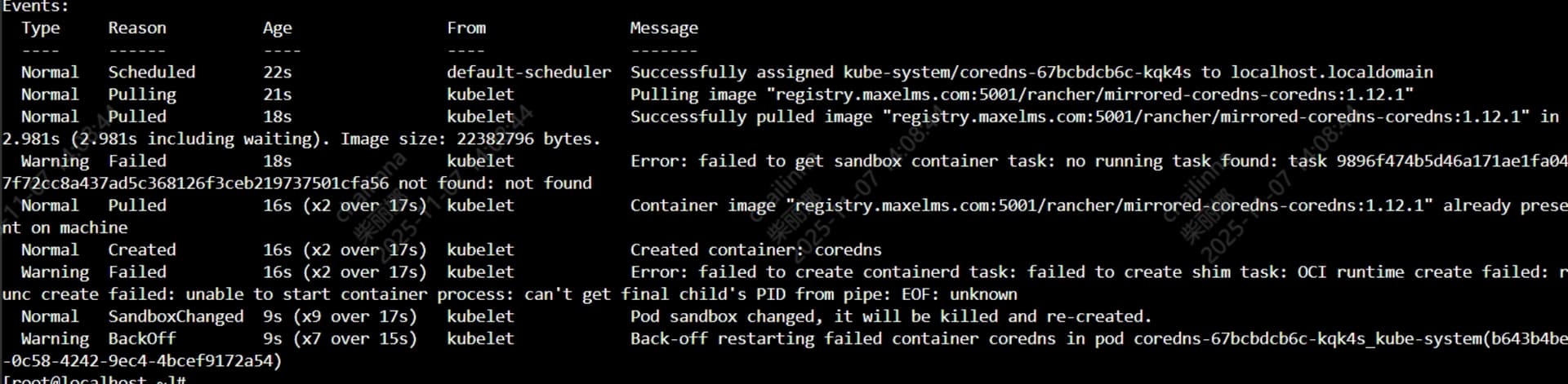 Normal Pulled 10s (x2 over 11s) kubelet Container image "registry.maxelms.com:5001/rancher/mirrored-coredns-coredns:1.12.1" already present on machine