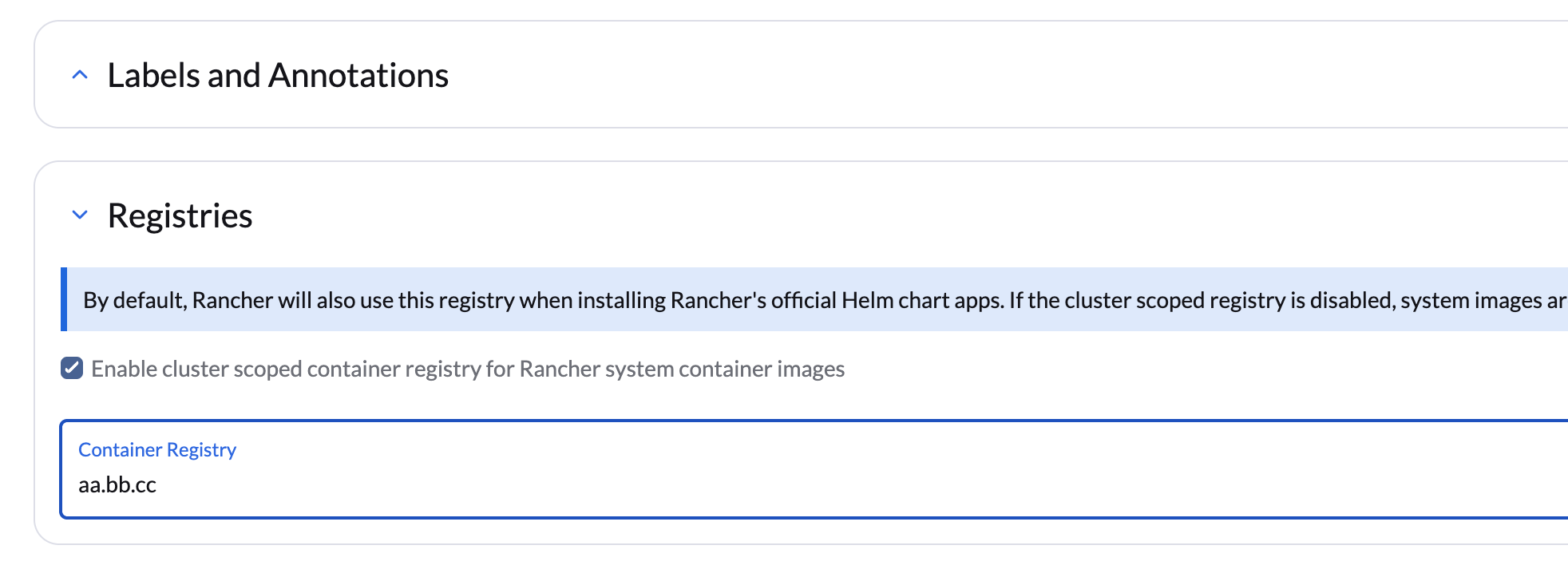 参考:[RFE] Cluster level private registry for imported Air-gapped setup · Issue #35192 · rancher/rancher · GitHub