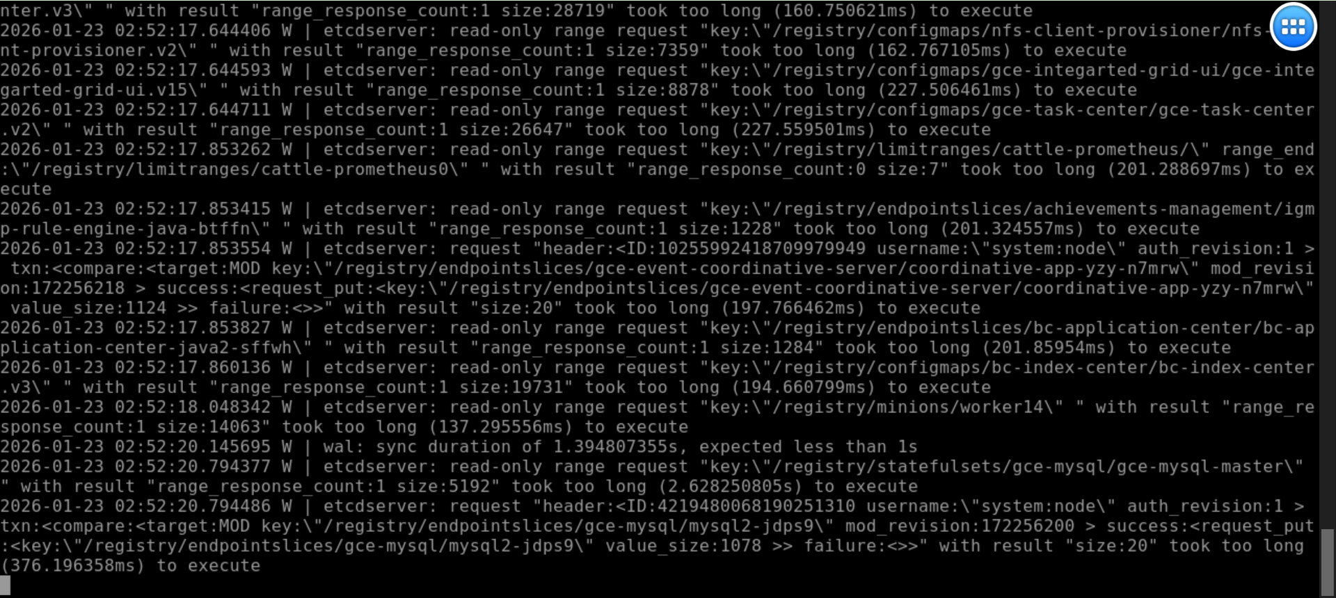 这些日志信息显示了 etcd 服务器在处理只读范围请求时出现了延迟,部分请求的执行时间超过了预期。这通常表明 etcd 的性能存在问题,可能的原因包括: