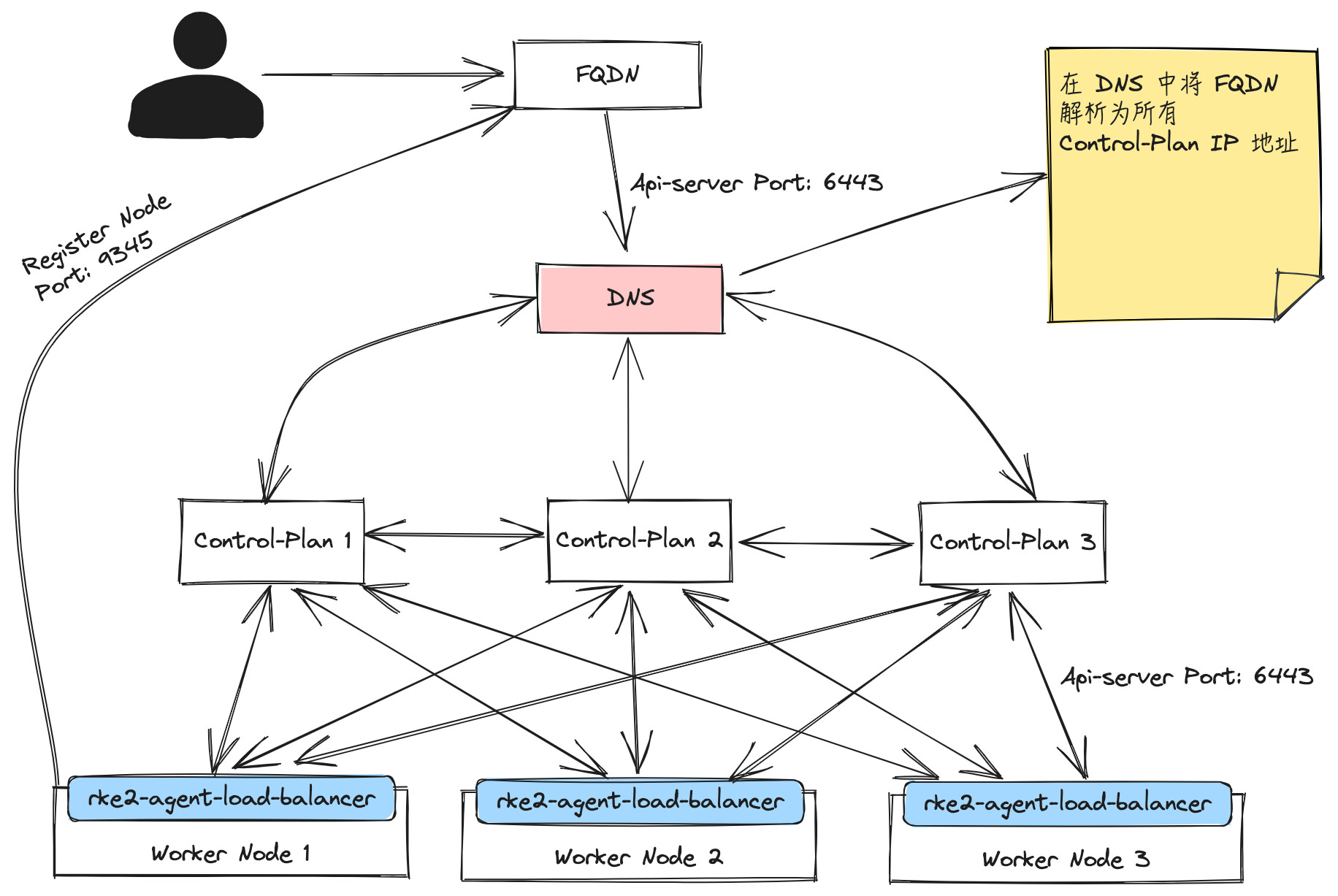 但是我又看到论坛中的其他帖子中关于HA,是针对RKE2的,负载的端口是9345与6443,流程图如下: