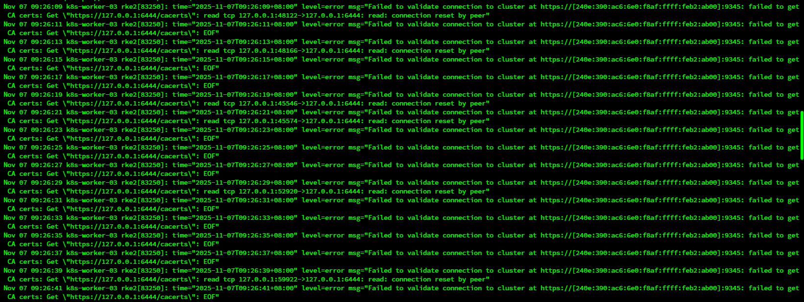 Nov 07 09:19:50 k8s-worker-03 rke2[63168]: time=“2025-11-07T09:19:50+08:00” level=error msg=“Failed to validate connection to cluster at https://[240e:390:ac6:6e0:f8af:ffff:feb2:ab00]:9345: failed to get CA certs: Get "https://127.0.0.1:6444/cacerts\”: EOF"