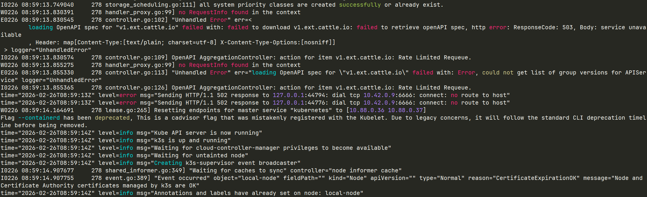time=“2026-02-26T08:57:31Z” level=info msg=“Active TLS secret / (ver=) (count 10): map[listener.cattle.io/cn-02d6d602dfad:02d6d602dfad listener.cattle.io/cn-10.43.0.1:10.43.0.1 listener.cattle.io/cn-10.88.0.37:10.88.0.37 listener.cattle.io/cn-127.0.0.1:127.0.0.1 listener.cattle.io/cn-__1-f16284:::1 listener.cattle.io/cn-kubernetes:kubernetes listener.cattle.io/cn-kubernetes.default:kubernetes.default listener.cattle.io/cn-kubernetes.default.svc:kubernetes.default.svc listener.cattle.io/cn-kubernetes.default.svc.cluster.local:kubernetes.default.svc.cluster.local listener.cattle.io/cn-localhost:localhost listener.cattle.io/fingerprint:SHA1=A9F5F12B36BE944AD14360DD2789110C6B8B0F36]”