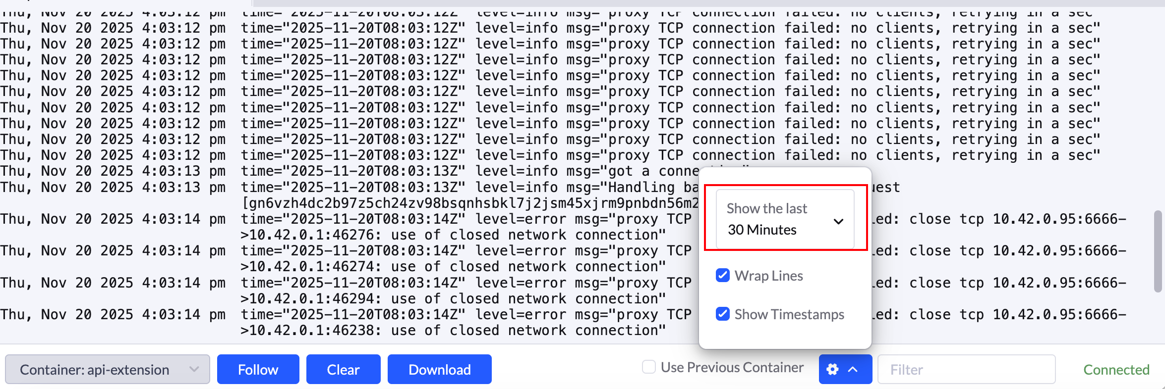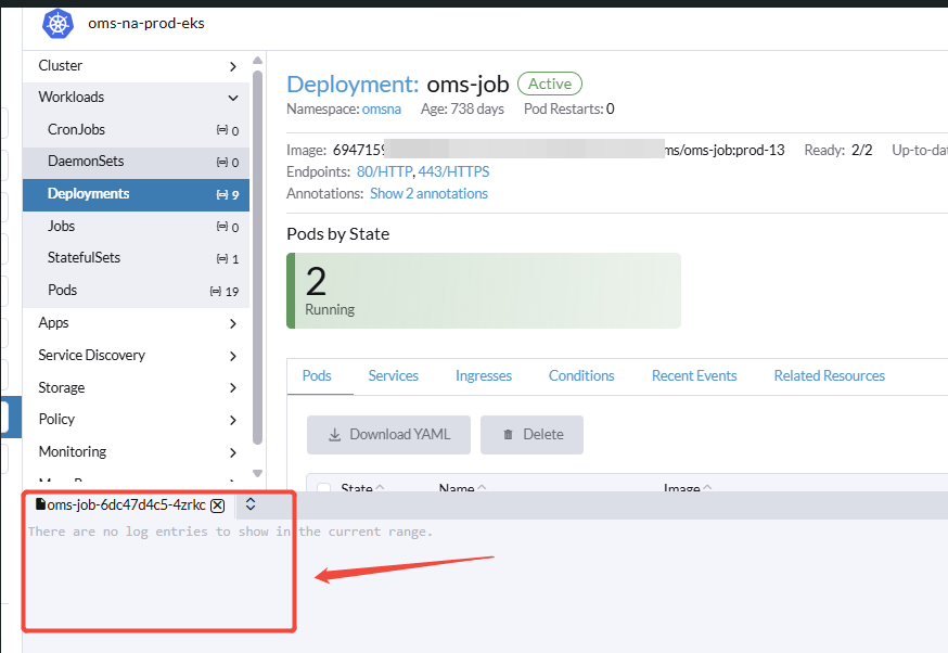 登录rancher UI后打开部分pod的“view logs”,显示无日志,但是下载日志文件后能看到全部日志内容,这个问题在个别deployment负载的pod中出现。