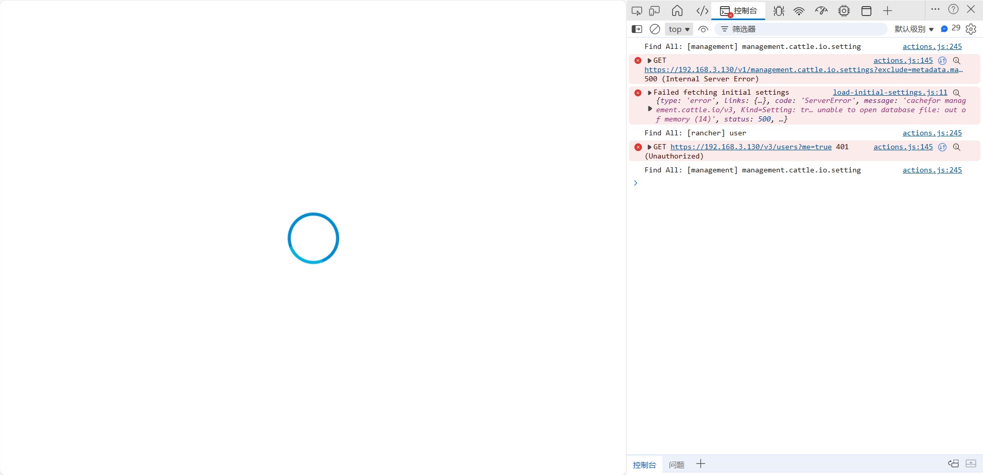2025/11/25 13:12:43 [ERROR] Unknown error: cachefor management.cattle.io/v3, Kind=Setting: transaction: begin tx: unable to open database file: out of memory (14)