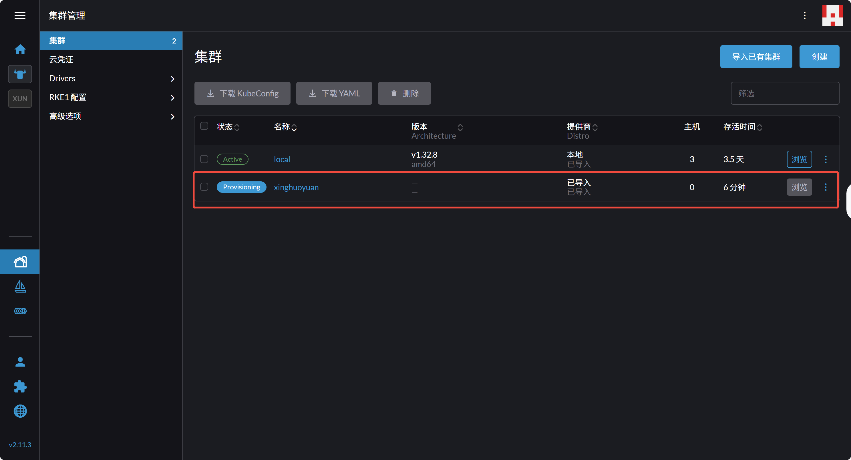 有local 集群,但重新导入集群后(在master上执行),集群一直处于Provisioning 状态