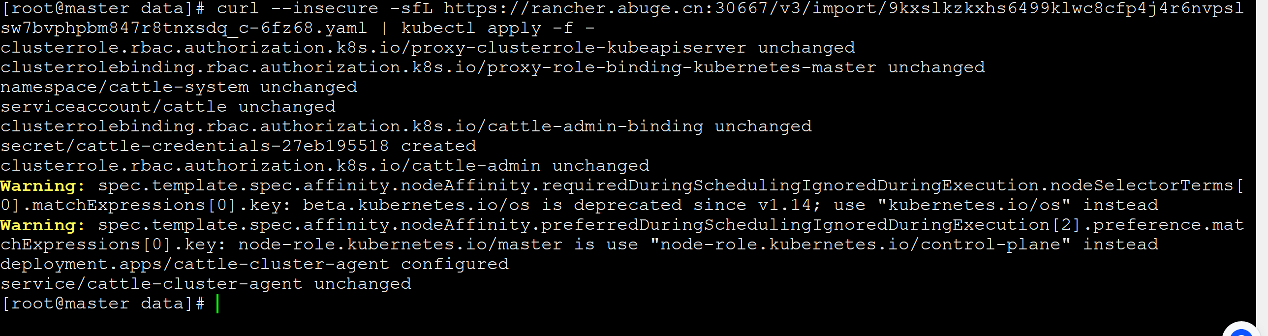 curl --insecure -sfL https://rancher.abuge.cn:30667/v3/import/9kxslkzkxhs6499klwc8cfp4j4r6nvpslsw7bvphpbm847r8tnxsdq_c-6fz68.yaml | kubectl apply -f -