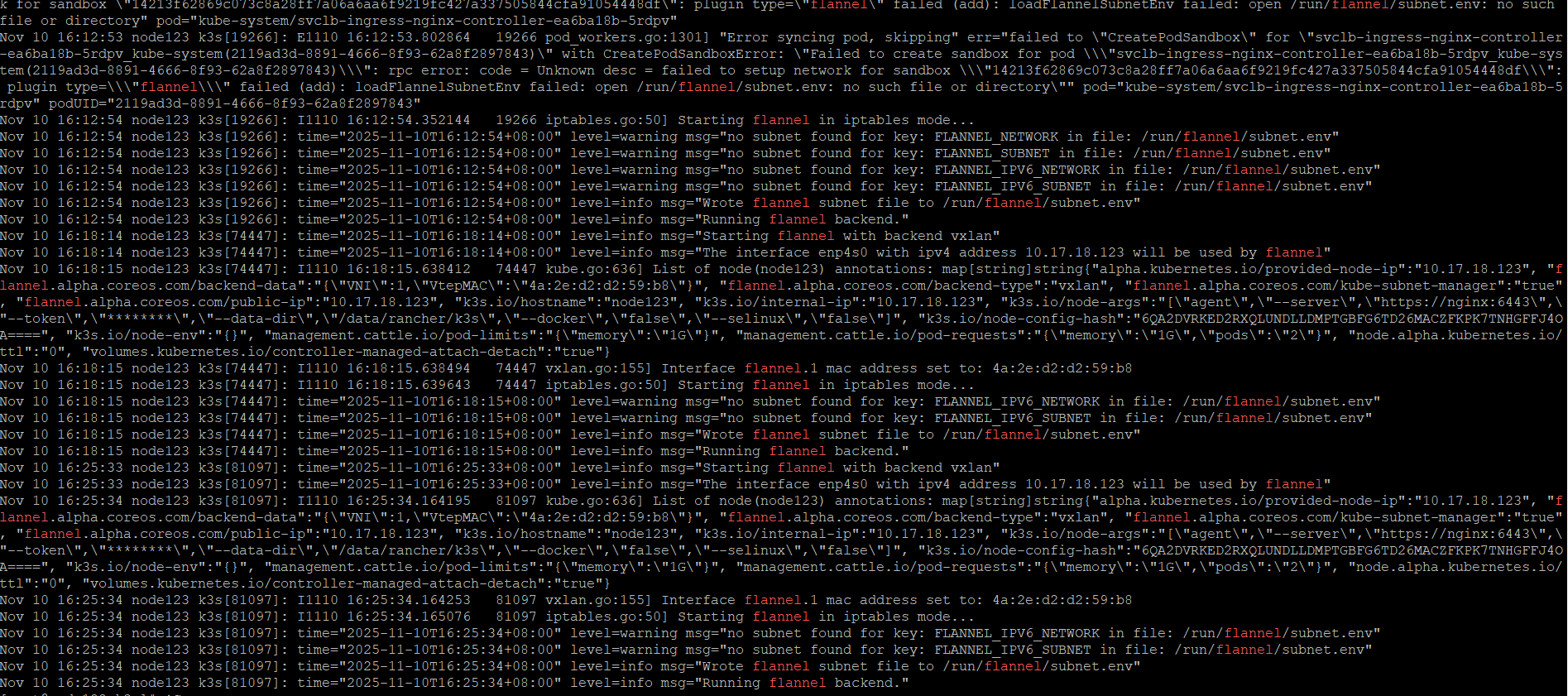 Failed to create pod sandbox: rpc error: code = Unknown desc = failed to setup network for sandbox “3c610e03d320400574cd9d96d9c951550e94fd339f0b530df64bced6bd7ccee5”: plugin type=“flannel” failed (add): loadFlannelSubnetEnv failed: open /run/flannel/subnet.env: no such file or directory