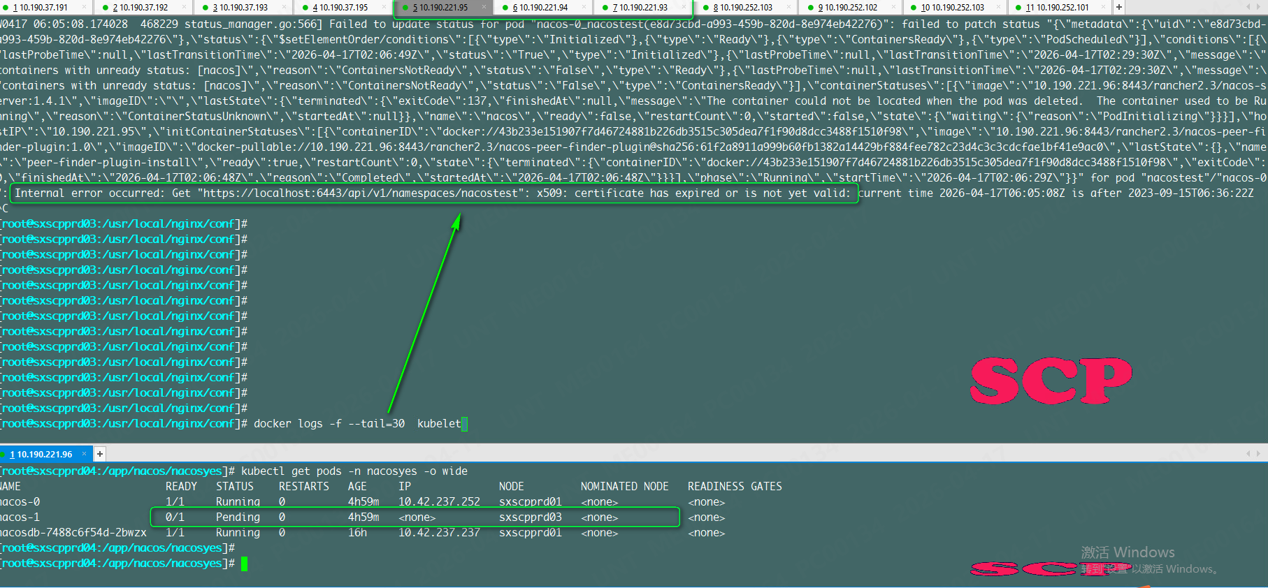 {\"containerID\":\"docker://43b233e151907f7d46724881b226db3515c305dea7f1f90d8dcc3488f1510f98\",\"exitCode\":0,\"finishedAt\":\"2026-04-17T02:06:48Z\",\"reason\":\"Completed\",\"startedAt\":\"2026-04-17T02:06:48Z\"}}}],\"phase\":\"Running\",\"startTime\":\"2026-04-17T02:06:29Z\"}}" for pod "nacostest"/"nacos-0": Internal error occurred: Get "https://localhost:6443/api/v1/namespaces/nacostest": x509: certificate has expired or is not yet valid: current time 2026-04-17T05:57:48Z is after 2023-09-15T06:36:22Z